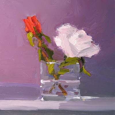 I don't usually paint still-lifes, but I didn't have a particular subject in mind today so I put a couple of roses in a glass and decided to paint that.
